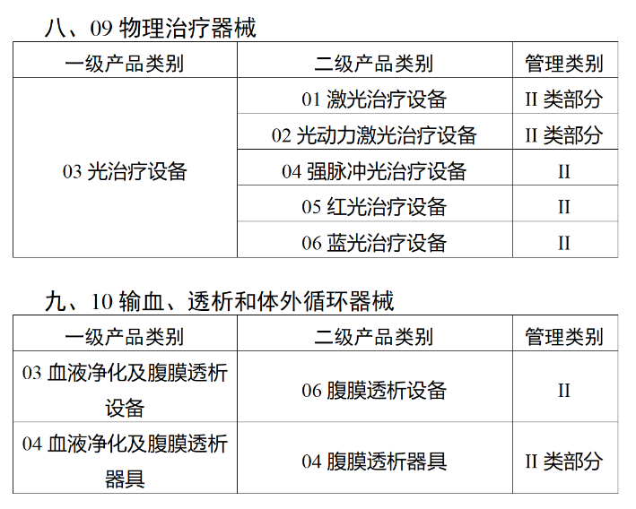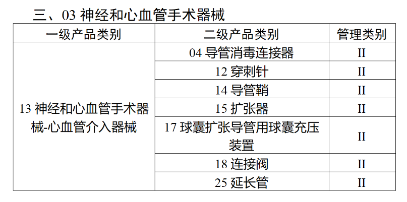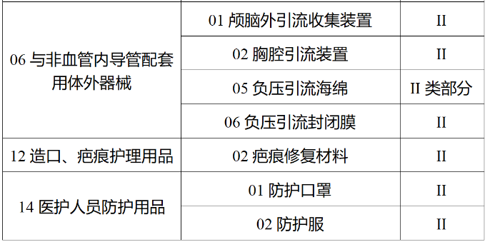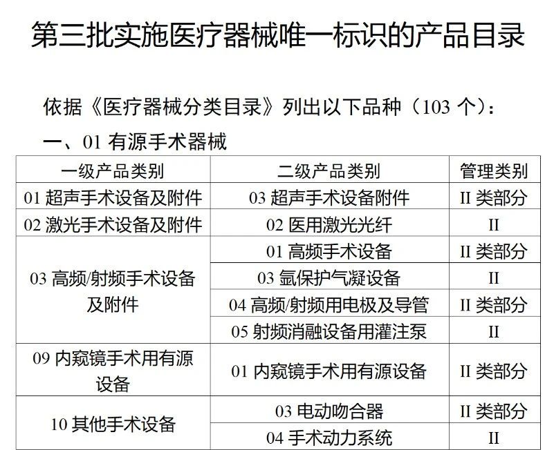 其中包括超聲手術設備附件、醫用激光光纖、高頻/射頻用電極及導管、射頻消融設備用灌注泵、內窺鏡手術用有源設備、電動吻合器、血管縫合裝置、不可吸收縫合線、骨水泥器械、腹膜透析設備、起搏系統分析設備、造影導管、眼科冷凍治療設備、助聽器、血細胞分析儀器等103個醫療器械品種。