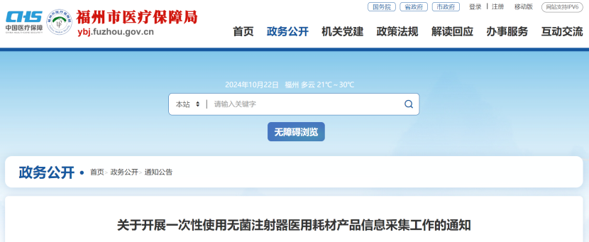 近日,福建福州醫保局發布《關于開展一次性使用無菌注射器醫用耗材產品信息采集工作的通知》,擬開展一次性使用無菌注射器集中帶量采購工作。