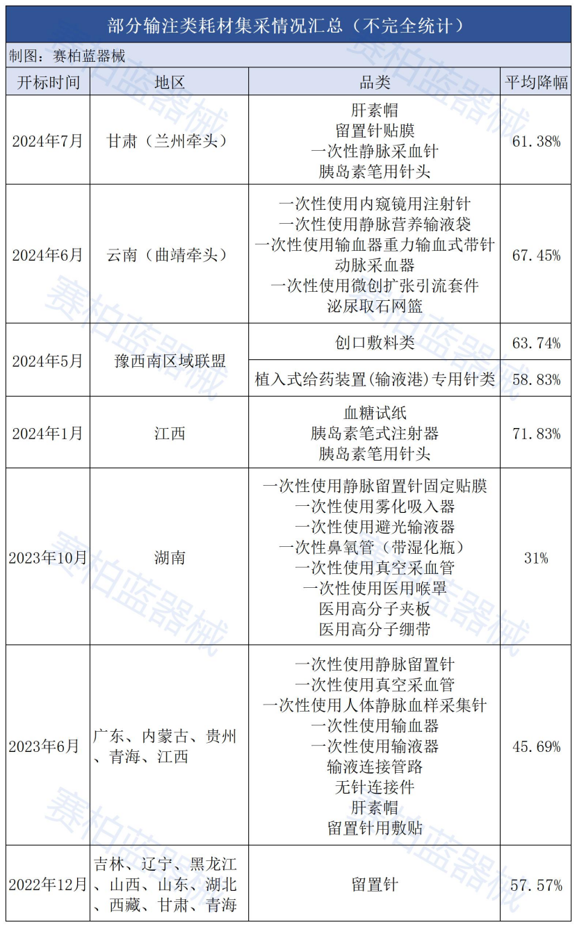 據不完全統計,去年至今,甘肅、云南、江西、湖南、河南、廣東、內蒙古、貴州、青海、江西等諸多地區都曾開展了輸注類耗材集采,推動相關產品進一步降價。