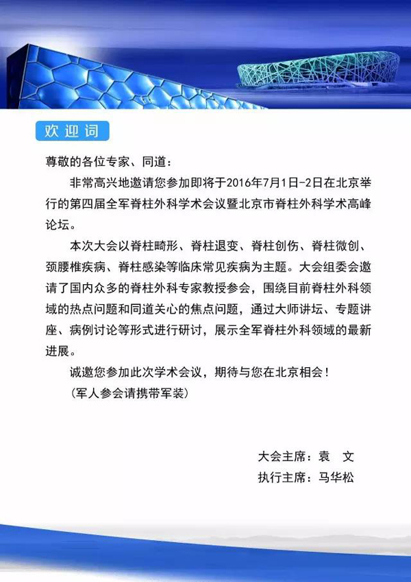 第四屆全軍脊柱外科學(xué)術(shù)會(huì)議暨北京市脊柱外科學(xué)術(shù)高峰論壇將于2016年7月2日在北京遠(yuǎn)望樓賓館舉行。