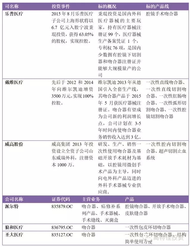 吻合器企業的成長性不足,銷售過億的企業屈指可數。企業若有一定市場占有率則是比較好的被上市公司并購的標的。需關注擬投資企業的產品線、品牌、市場推廣能力以及醫保地域差異等綜合因素。此外可關注有特色的吻合器行業如男科吻合器。