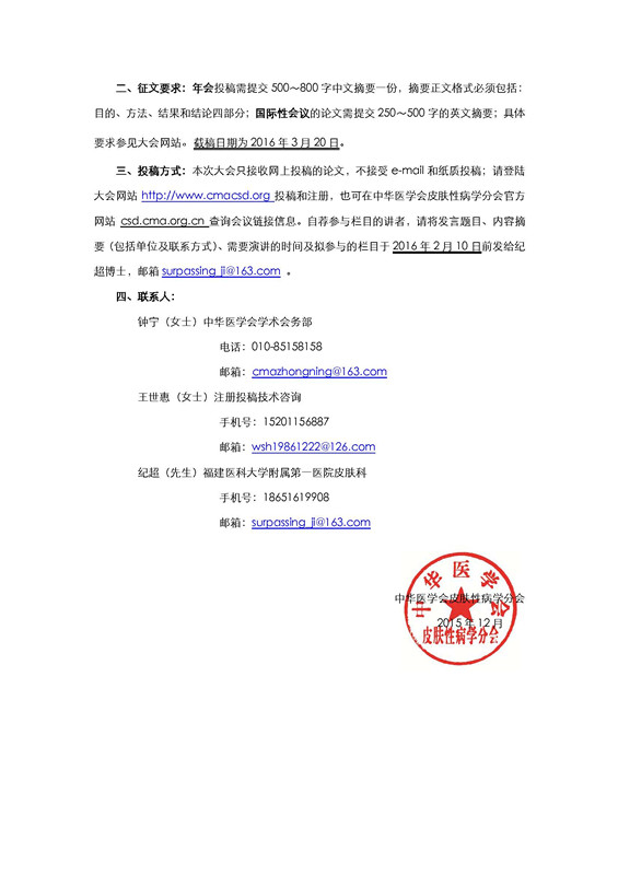 三、投稿方式:本次大會只接收網上投稿的論文,不接受e-mail和紙質投稿;請登陸大會網站http://2016.cmacsd.org/投稿和注冊,也可在中華醫學會皮膚性病學分會官方網站csd.cma.org.cn查詢會議鏈接信息。自薦參與欄目的講者,請將發言題目、內容摘要(包括單位及聯系方式)、需要演講的時間及擬參與的欄目于2016年2月10日前發給紀超博士,郵箱surpassing_ji@163.com 。