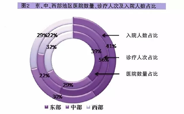 東中西部地區的醫院數量與入院人數基本成正比,主要差異在于診療人次,東部地區醫院數量占全國醫院數量的39%,但卻承擔了56%的全國醫院診療量。