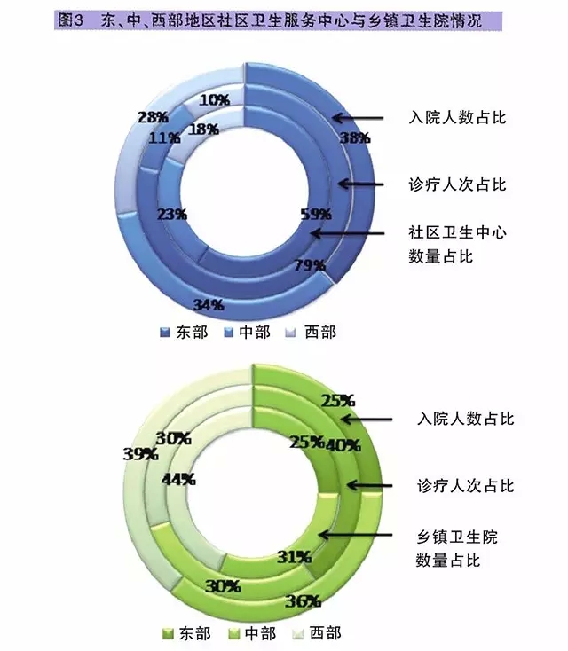 東部地區建立的城市社區衛生服務中心(站)占全國的占比超過六成,承擔了近八成的社區衛生中心診療量,但東部地區社區衛生中心的平均入院人數少于中西部地區。中西部地區鄉鎮衛生院的數量與入院人數要高于東部地區,但診療量還是東部地區的鄉鎮衛生院較多。