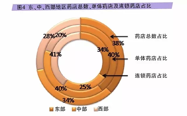 藥店連鎖率是一個地區零售藥品市場集約化程度高低的重要指標,藥店數量最多的廣東省,藥店連鎖率卻是藥店數量最多的前五省份中最低的。廣東省藥店連鎖率較低可能與當地民眾更善于自我藥療(特別是中醫藥療),藥店客源比較充足,生存壓力較小,單體藥店連鎖化欲望較低有關。四川省藥店連鎖率高達83.87%,推測其主要原因在于加盟模式在該省市盛行,匯總統計時將加盟店都劃入連鎖體系內有關。