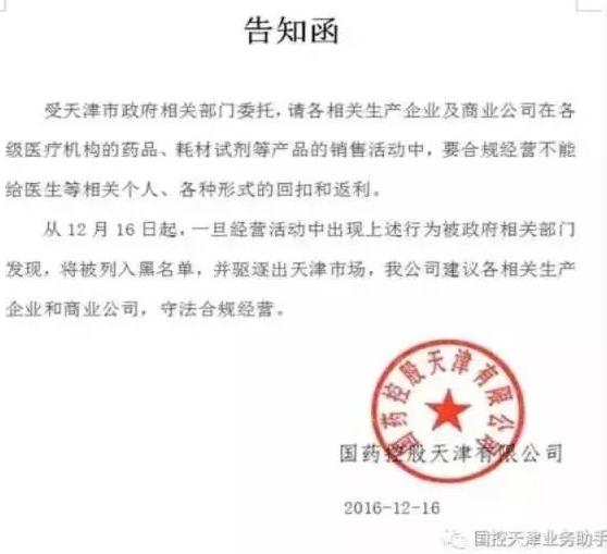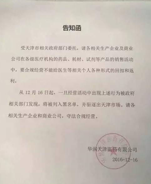 兩大商業(yè)巨頭的通知發(fā)出時(shí)間一致,內(nèi)容也高度一致,應(yīng)都是與天津市衛(wèi)計(jì)委掀起的行風(fēng)大整肅專項(xiàng)工作有關(guān)。而天津市坊間近期也正在流傳一事,“天津有醫(yī)院院長正在被實(shí)名舉報(bào)”。
