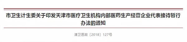 5月18日,天津市衛計委印發《天津市醫療衛生機構內部醫藥生產經營企業代表接待暫行辦法》(以下簡稱暫行辦法)。