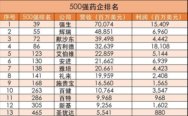 總共有13家藥企入選500強榜單。強生以700.74億美元營收排名藥企第一,總榜單第39位。藥企中僅次于強生的是輝瑞,營收488.51億美元,利潤69.6億美元。其他上榜的藥企包括默沙東、吉利德、艾伯維、安進、雅培、禮來、施貴寶、百健、百特、新基、圣猶達。