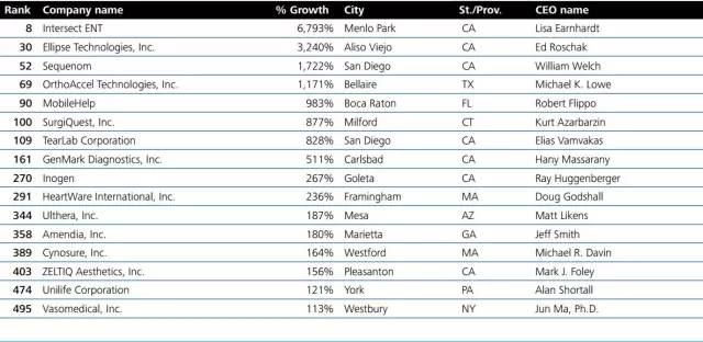 和往年一樣,快到11月底的時(shí)候,德勤公布了2015年北美區(qū)高科技成長企業(yè)500強(qiáng)名單,企業(yè)占比最多的依然來自軟件開發(fā)行業(yè),較少的為儀器儀表行業(yè)。動(dòng)脈網(wǎng)第一時(shí)間為大家梳理了其中行業(yè)為醫(yī)療器械類的公司,共有十六家。
