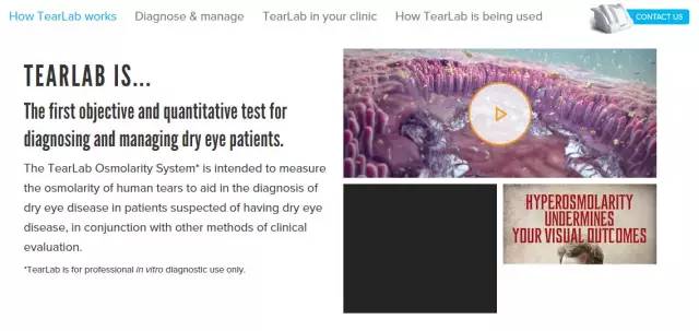 TearLab擁有的專利-眼淚測試系統(tǒng)TearLab Osmolarity System,可用于衡量淚膜的同滲容摩,而眼淚同滲容摩則被視作與干眼病具有關(guān)聯(lián)度的一種生物標(biāo)記。簡單的說就是一句話, 通過眼淚來診斷干眼病。病人只需用TearLab的儀器采集50nl的眼淚,便可在1分鐘內(nèi)檢測出干眼病的結(jié)果。