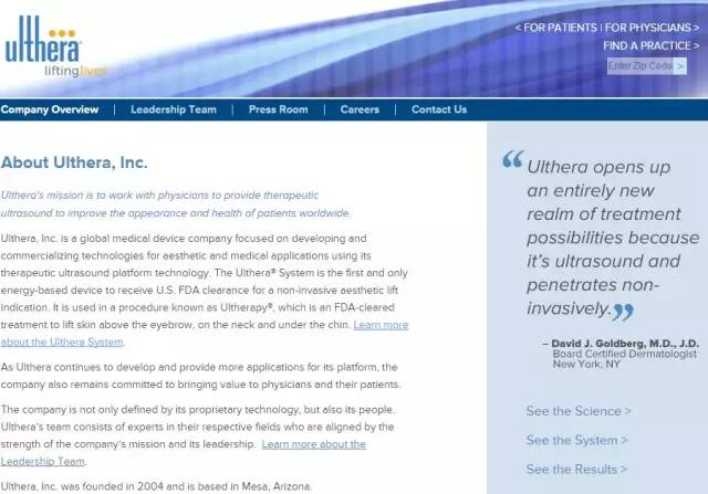美國Ulthera公司,成立于2004年,位于美國亞利桑那州,梅薩市。 Ulthera公司是全球頂級醫(yī)療設(shè)備公司,專注于開發(fā)超聲波美容儀器。
