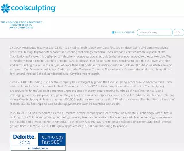 ZELTIQ Aesthetics成立于2005年,是一家醫(yī)療高科技公司,總部位于美國加州普萊臣頓,其主營業(yè)務(wù)是美容減肥產(chǎn)品的研發(fā)和商業(yè)化運(yùn)營。