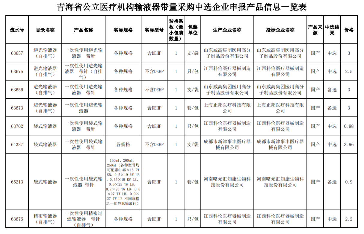 醫(yī)藥網9月18日訊 9月15日,青海省藥品和醫(yī)用耗材集中采購網發(fā)布《關于公布青海省公立醫(yī)療機構醫(yī)用耗材帶量采購中選企業(yè)申報產品信息的通知》,將留置針、輸液器帶量采購中選企業(yè)申報產品信息進行公布。