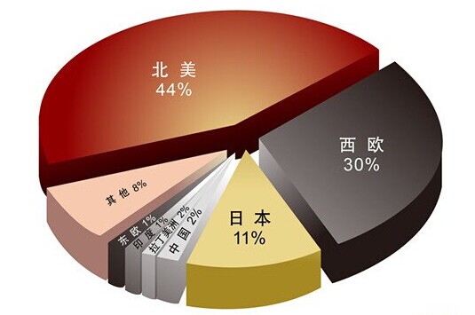 從全球體外診斷試劑市場劃分來看,最大的體外診斷試劑市場為北美地區,占了44%,而西歐市場占據了30%,亞洲的日本和中國分別占有11%和2%。