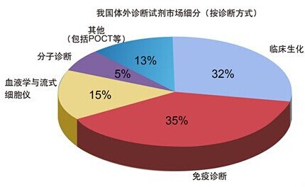 體外診斷試劑包含血液、生化、免疫、分子生物、細菌、POCT等幾大方面。從全球體外診斷試劑市場按照診斷方式細分,免疫診斷,臨床生化診斷以及分子診斷占據前三,發達國家的臨床生化診斷和免疫診斷市場已經接近成熟,而POCT和分子診斷是診斷市場的主要增長點。中國的免疫診斷試劑,臨床生化診斷試劑是最主要的兩大體外診斷試劑市場。