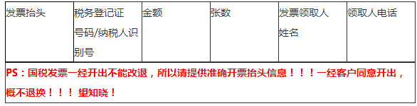 PS:國稅發(fā)票一經開出不能改退,所以請?zhí)峁蚀_開票抬頭信息!!!一經客戶同意開出,概不退換!!! 望知曉!
