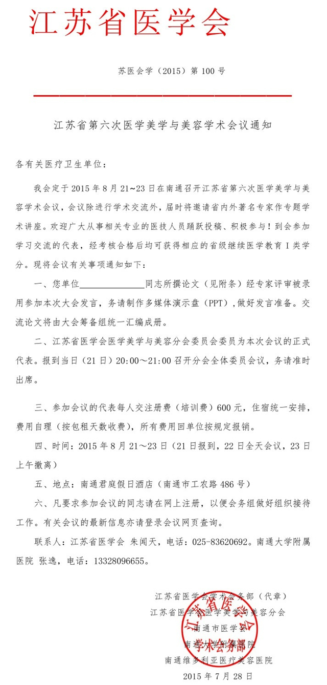 江蘇省第六次醫(yī)學(xué)美學(xué)與美容學(xué)術(shù)會議將于2015年8月21-23日在南通召開。