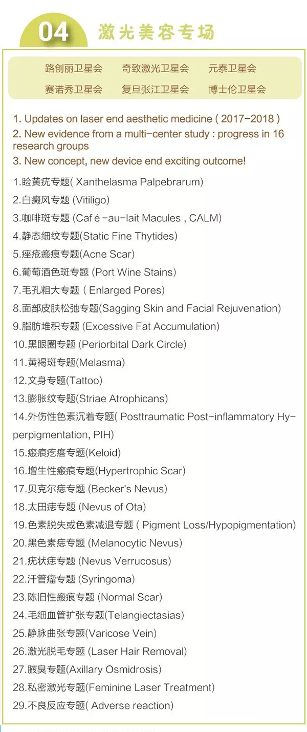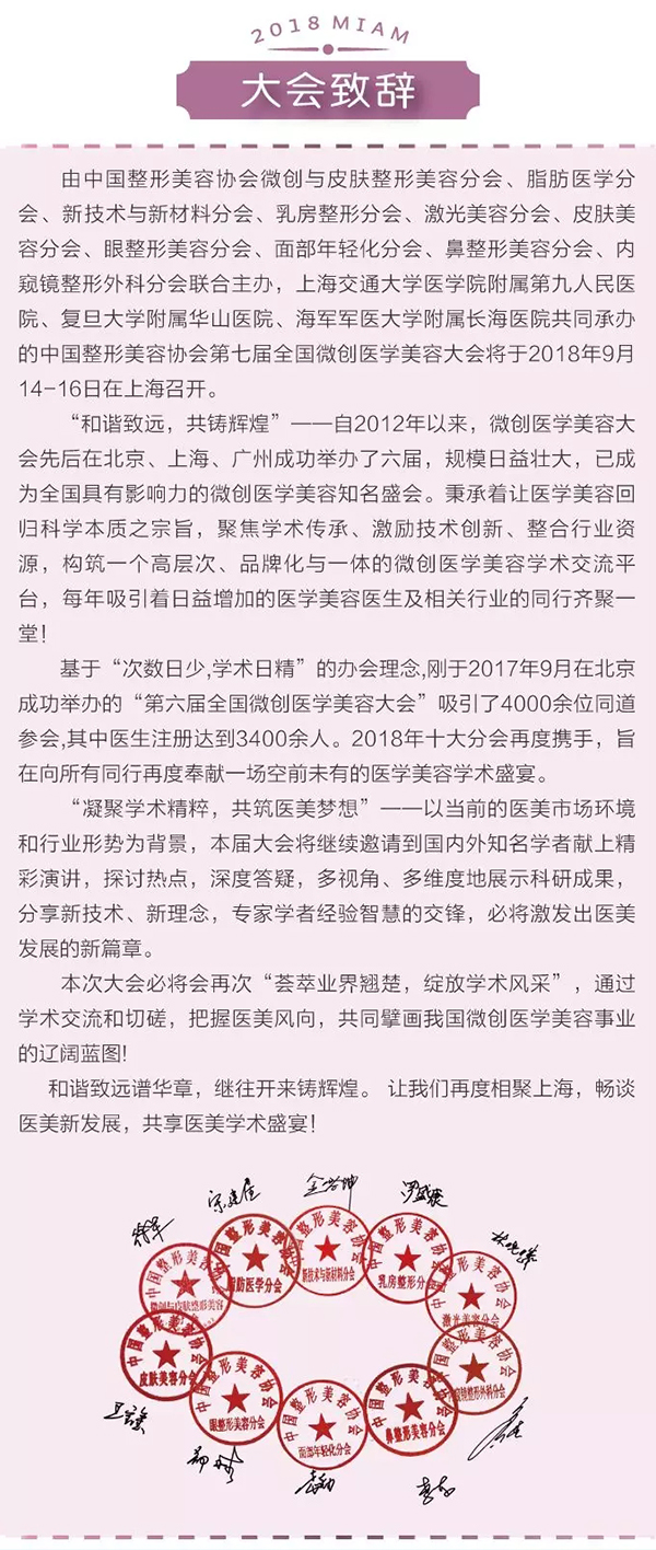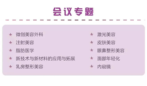 主辦單位:中國整形美容協會微創與皮膚整形美容分會 · 脂肪醫學分會新技術與新材料分會 · 乳房整形分會激光美容分會 · 皮膚美容分會眼整形美容分會 · 面部年輕化分會鼻整形美容分會 · 內窺鏡整形外科分會