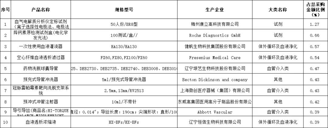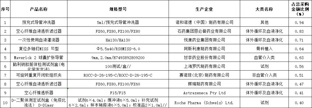 其中醫(yī)用耗材網(wǎng)上采購金額排名前10位如下表所示,合計金額為0.14億元,占醫(yī)用耗材總采購金額6.11%。
