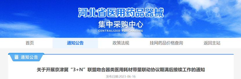 6月16日,河北省醫用藥品器械集中采購中心發布《關于開展京津冀“3+N”聯盟吻合器類醫用耗材帶量聯動協議期滿后接續工作的通知》(以下簡稱《通知》)。