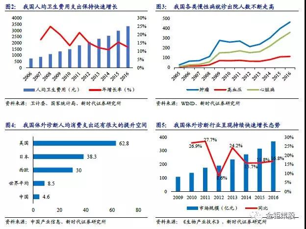 可以看到我國人均衛生費用支出保持持續快速增長,各類慢性病(腫瘤、心臟病、高血壓等)的出院人次也是迭創新高。目前我國的診斷滲透率還比較低,從整體體外診斷人均消費來看,我國人均體外診斷消費金額僅4.6美元,相較全球平均水平8.5美元還有較大的差異,和發達國家歐美日等相比更是還有十倍的差距。我國體外診斷行業過去幾年已經取得了快速的發展,行業規模從2009年的108億增長到了2016年的369億,年均復合增長率高達16.6%。未來隨著人口老齡化的加劇,人均醫療費用支出的增長以及技術的進步,我國體外診斷行業未來5年都有望保持持續快速發展,千億市場值得期待。