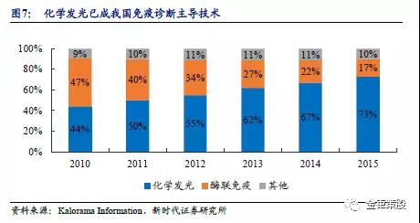 化學發光快速取代酶聯免疫,已成為免疫診斷主導技術平臺。免疫診斷領域的技術歷經了多個發展階段,從放射免疫、酶聯免疫、免疫膠體金到化學發光技術、電化學發光、流式熒光技術等。化學發光憑借其靈敏度高、特異性好、自動化程度高、精密度好、準確率高等優勢在臨床應用中迅速推廣,快速實現了對酶聯免疫的替代,目前已經成為免疫定量分析領域的主流技術,占據了超過70%的市場份額。
