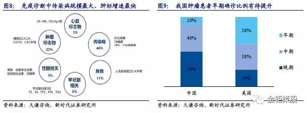 傳染病規模最大,腫瘤標志物增速最快,國產企業技術突破首選的兩大方向。免疫診斷常見應用領域有傳染病、腫瘤標志物、性腺、心臟標志物、甲狀腺等等,其中傳染病和腫瘤標志物規模較大,分別占據了40%和25%的比例。傳染病檢測規模最大,而腫瘤標志物檢測則增速更快,更具增長潛力。