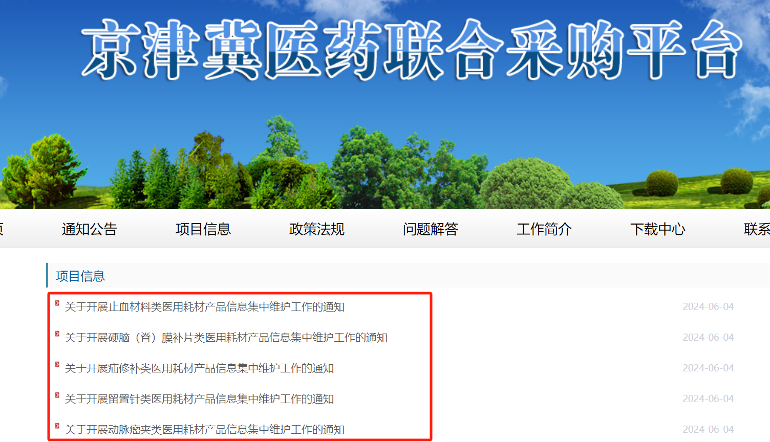 6月4日,天津市醫(yī)藥采購中心接連發(fā)布發(fā)布5則通知:將于6月6日起對動脈瘤夾、留置針、疝修補(bǔ)、硬腦(脊)膜補(bǔ)片、止血材料5類耗材開展信息集中維護(hù)工作。