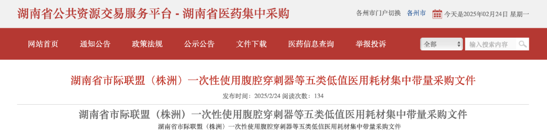 2月24日,湖南省公共資源交易平臺發布《關于公布湖南省市際聯盟(株洲)次性使用腹腔穿刺器等五類低值醫用耗材集中帶量采購文件的通知》,開展一次性使用腹腔穿刺器、壓力傳感器、一次性使用靜脈留置針、一次性使用腰硬聯合麻醉穿刺包、醫用膠片集中帶量采購工作。