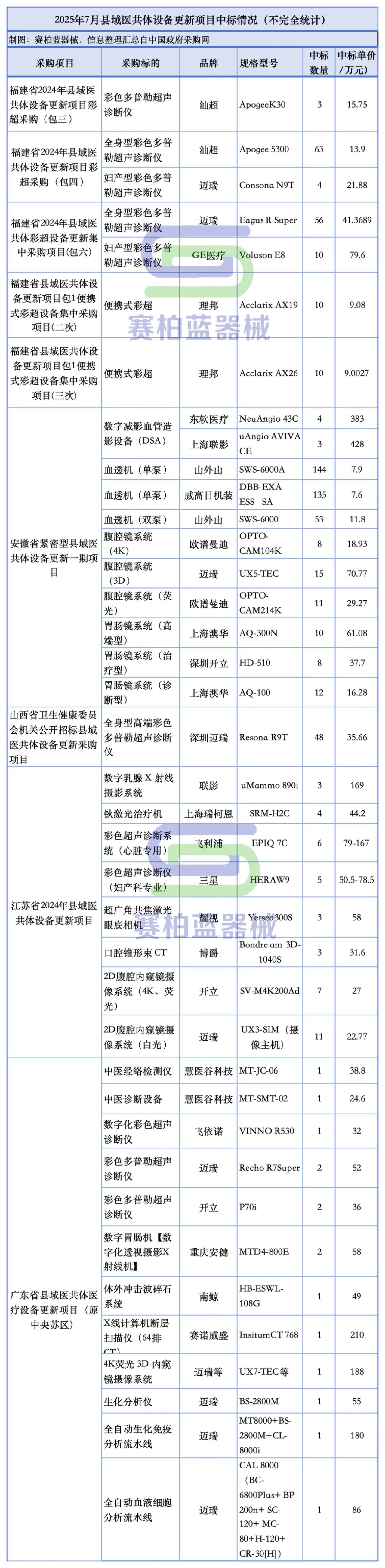 綜合來看,今年以來的縣域醫共體設備更新項目中,部分已經形成了規模效應,其中影像設備采購數量較大,體外診斷、血透設備等領域也有百臺以上的訂單出現。