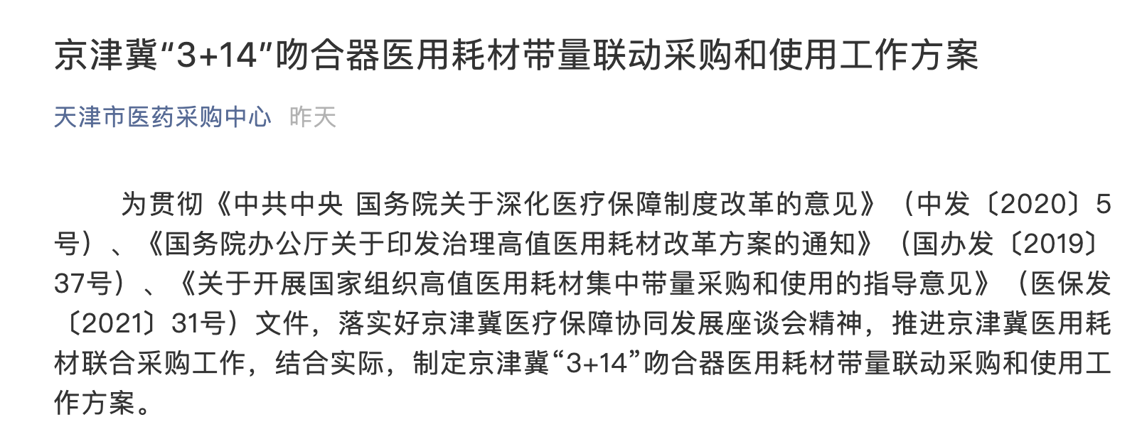 11月23日,天津市醫藥采購中心、北京市醫藥集中采購服務中心、河北省醫用藥品器械集中采購中心聯合發布《京津冀“3+14”吻合器醫用耗材帶量聯動采購和使用工作方案》(以下簡稱《方案》)。