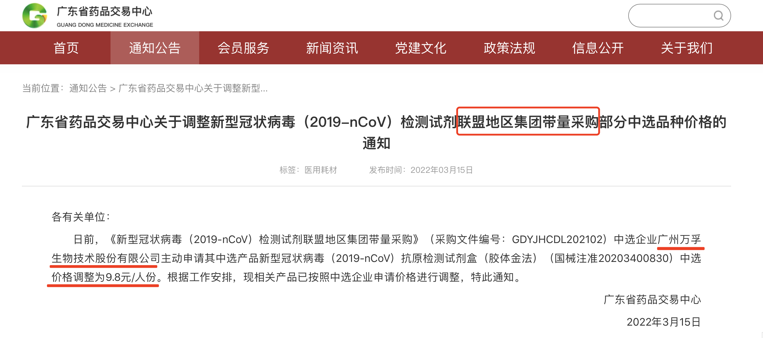 3月15日,廣東省藥品交易中心發(fā)布《關(guān)于調(diào)整新型冠狀病毒(2019-nCoV)檢測試劑聯(lián)盟地區(qū)集團帶量采購部分中選品種價格的通知》。需要注意的是,中選企業(yè)廣州萬孚生物技術(shù)股份有限公司主動申請其中選產(chǎn)品新型冠狀病毒(2019-nCoV)抗原檢測試劑盒(膠體金法)(國械注準20203400830)中選價格調(diào)整為9.8元/人份。