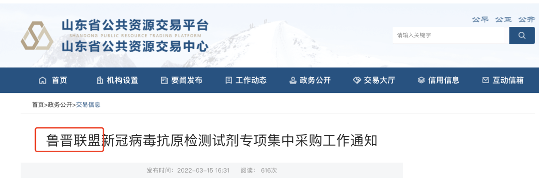 3月15日,山東省公共資源交易中心發(fā)布《魯晉聯(lián)盟新冠病毒抗原檢測試劑專項集中采購工作通知》,山東省、山西省組成聯(lián)盟(簡稱魯晉聯(lián)盟),開展新冠病毒抗原檢測試劑產(chǎn)品專項集中采購工作。采購主體是:符合新冠病毒抗原檢測要求的醫(yī)療機構(gòu)。
