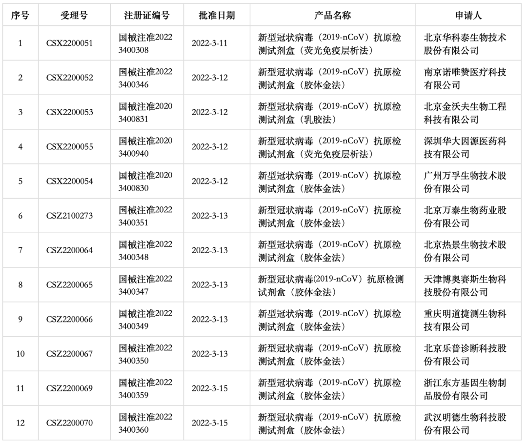 3月11日-13日,國家藥品監(jiān)督管理局醫(yī)療器械技術(shù)審評中心完成10個新冠抗原檢測產(chǎn)品應急審評,3月15日又完成2個新冠抗原檢測產(chǎn)品的應急審評工作,并獲得國家藥監(jiān)局審批。