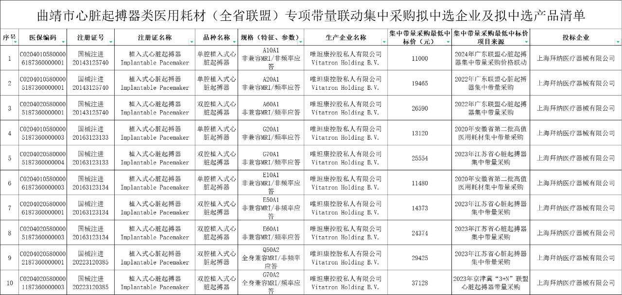 近日,云南公共資源交易中心公布曲靖市心臟起搏器類醫用耗材(全省聯盟)專項帶量聯動集中采購擬中選企業及擬中選產品清單。