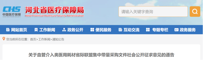 10月16日,河北醫(yī)保局發(fā)布《關(guān)于血管介入類醫(yī)用耗材省際聯(lián)盟集中帶量采購文件社會公開征求意見的通告》(附文末)。