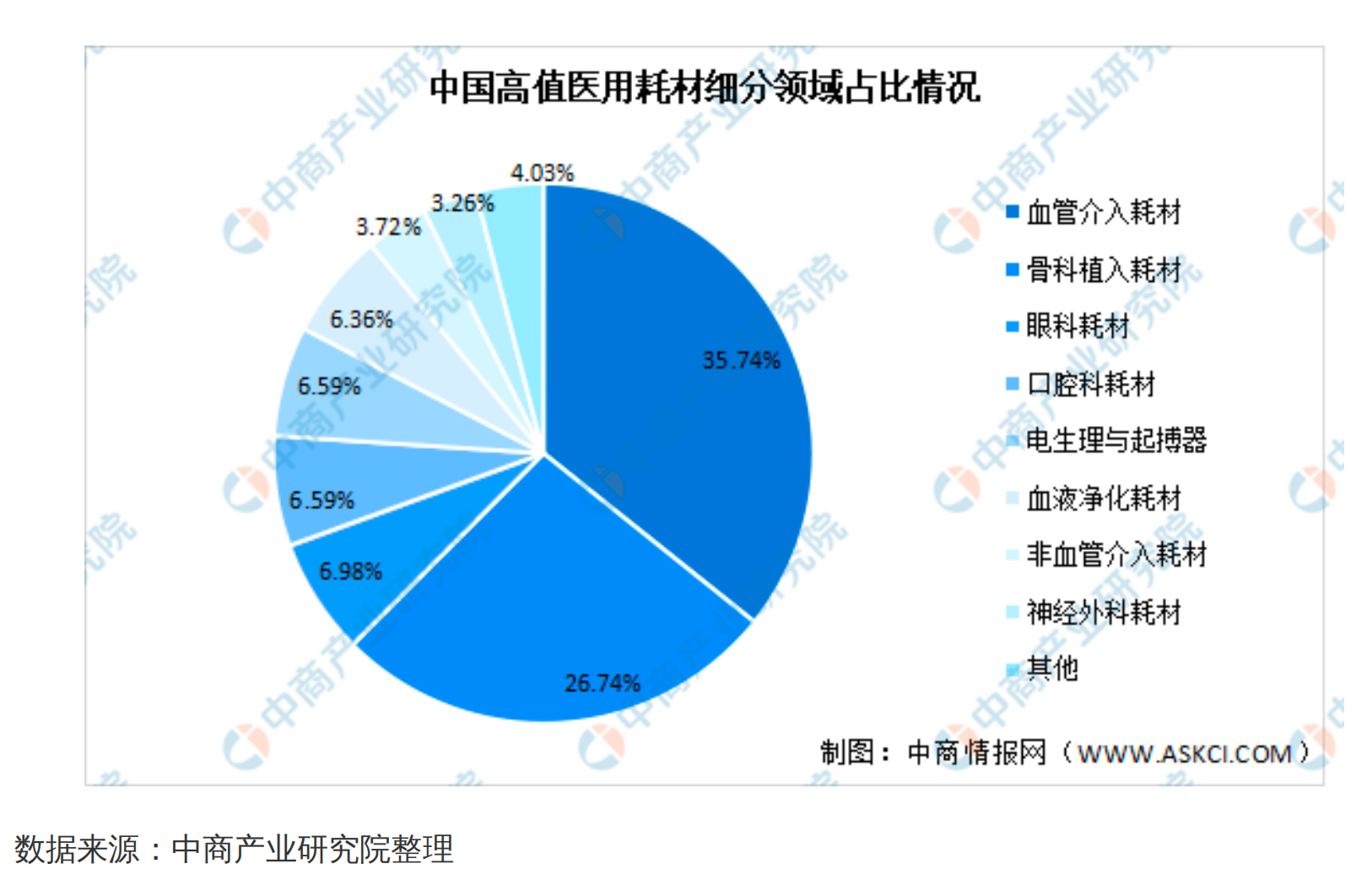 據(jù)中商產(chǎn)業(yè)研究院統(tǒng)計,高值醫(yī)用耗材細(xì)分市場中,2019年血管介入耗材規(guī)模為461億元,占比35.74%,是占比最高的細(xì)分市場。