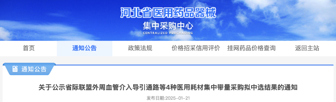 1月21日,河北省醫(yī)用藥品器械集中采購中心發(fā)布《關(guān)于公示省際聯(lián)盟外周血管介入導(dǎo)引通路等4種醫(yī)用耗材集中帶量采購擬中選結(jié)果的通知》,公示時間為2025年1月22日至2025年1月27日。