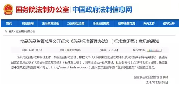 12月18日,國家食藥監管總局通過國務院法制辦公室官網發布《藥品標準管理辦法》(征求意見稿)(以下簡稱“征求意見稿”)。