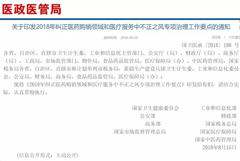 8月23日,國家衛健委、國家醫保局、市場總局、公安部、等九部委聯合印發《2018年糾正醫藥購銷領域和醫療服務中不正之風專項治理工作要點》(下稱《整治要點》)。