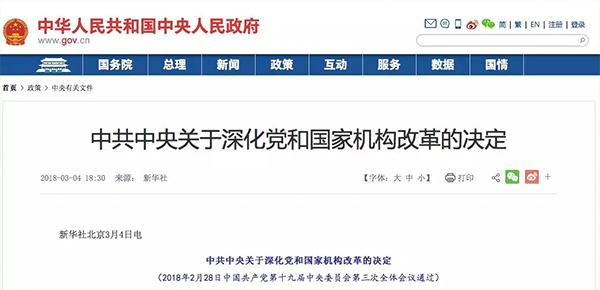 據新華社3月4日報道,中國共產黨第十九屆中央委員會第三次全體會議通過《中共中央關于深化黨和國家機構改革的決定》(下稱《決定》),并正式對外公布。