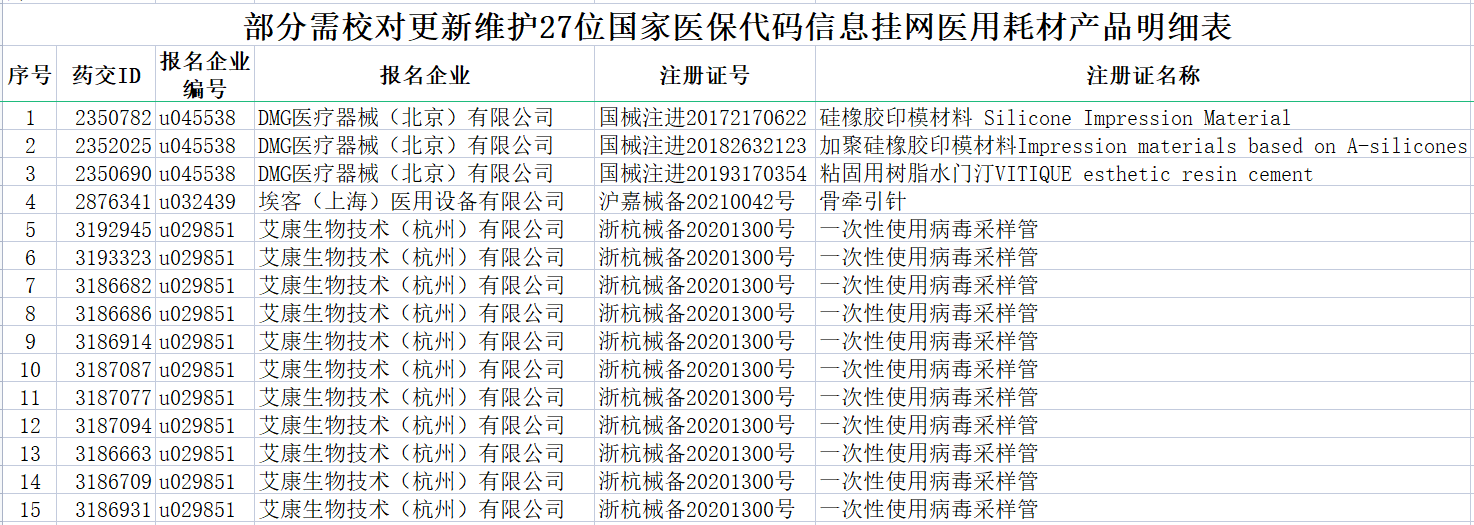 7月6日,重慶藥品交易所發(fā)布《關(guān)于進(jìn)一步做好維護(hù)國(guó)家醫(yī)保醫(yī)用耗材代碼工作的通知》。其中規(guī)定,國(guó)家醫(yī)保醫(yī)用耗材代碼維護(hù)范圍為屬于國(guó)家醫(yī)保醫(yī)用耗材分類目錄范圍,企業(yè)已在國(guó)家醫(yī)保局“醫(yī)保醫(yī)用耗材分類與代碼數(shù)據(jù)庫(kù)動(dòng)態(tài)維護(hù)”維護(hù)且通過(guò)公示進(jìn)入國(guó)家醫(yī)保醫(yī)用耗材分類與代碼數(shù)據(jù)庫(kù)的產(chǎn)品。如后續(xù)國(guó)家醫(yī)療保障局公示新批次國(guó)家醫(yī)保醫(yī)用耗材分類與代碼數(shù)據(jù)信息,此項(xiàng)工作繼續(xù)進(jìn)行。