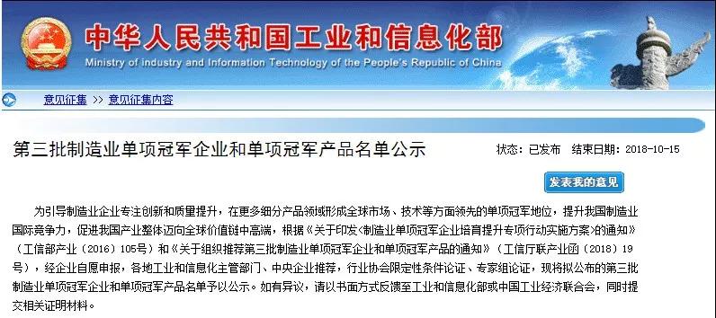 10月8日,中華人民共和國工業(yè)和信息化部對《第三批制造業(yè)單項冠軍企業(yè)和單項冠軍產品名單》進行公示。