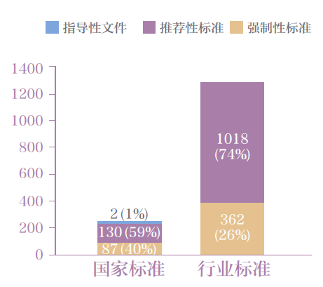按標(biāo)準(zhǔn)效力劃分,分為醫(yī)療器械強制性標(biāo)準(zhǔn)、醫(yī)療器械推薦性標(biāo)準(zhǔn)和指導(dǎo)性技術(shù)文件。其中,強制性標(biāo)準(zhǔn)449 份,推薦性標(biāo)準(zhǔn)1148 份,指導(dǎo)性技術(shù)文件2 份。醫(yī)療器械國家標(biāo)準(zhǔn)和行業(yè)標(biāo)準(zhǔn)按不同約束程度劃分的分布情況見圖2。