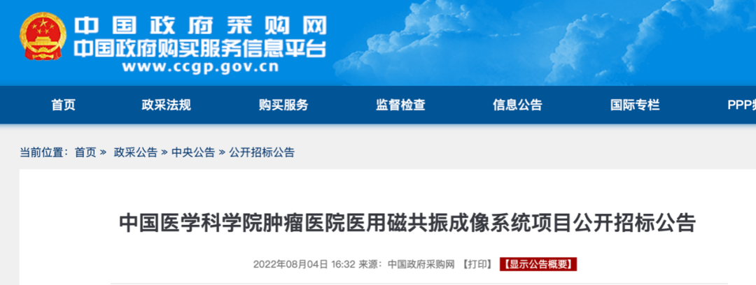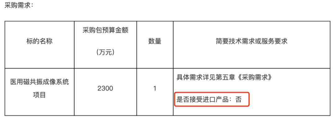 公告稱,中國醫學院腫瘤醫院預算2300萬采購醫用磁共振成像系統,表示不接受進口產品。