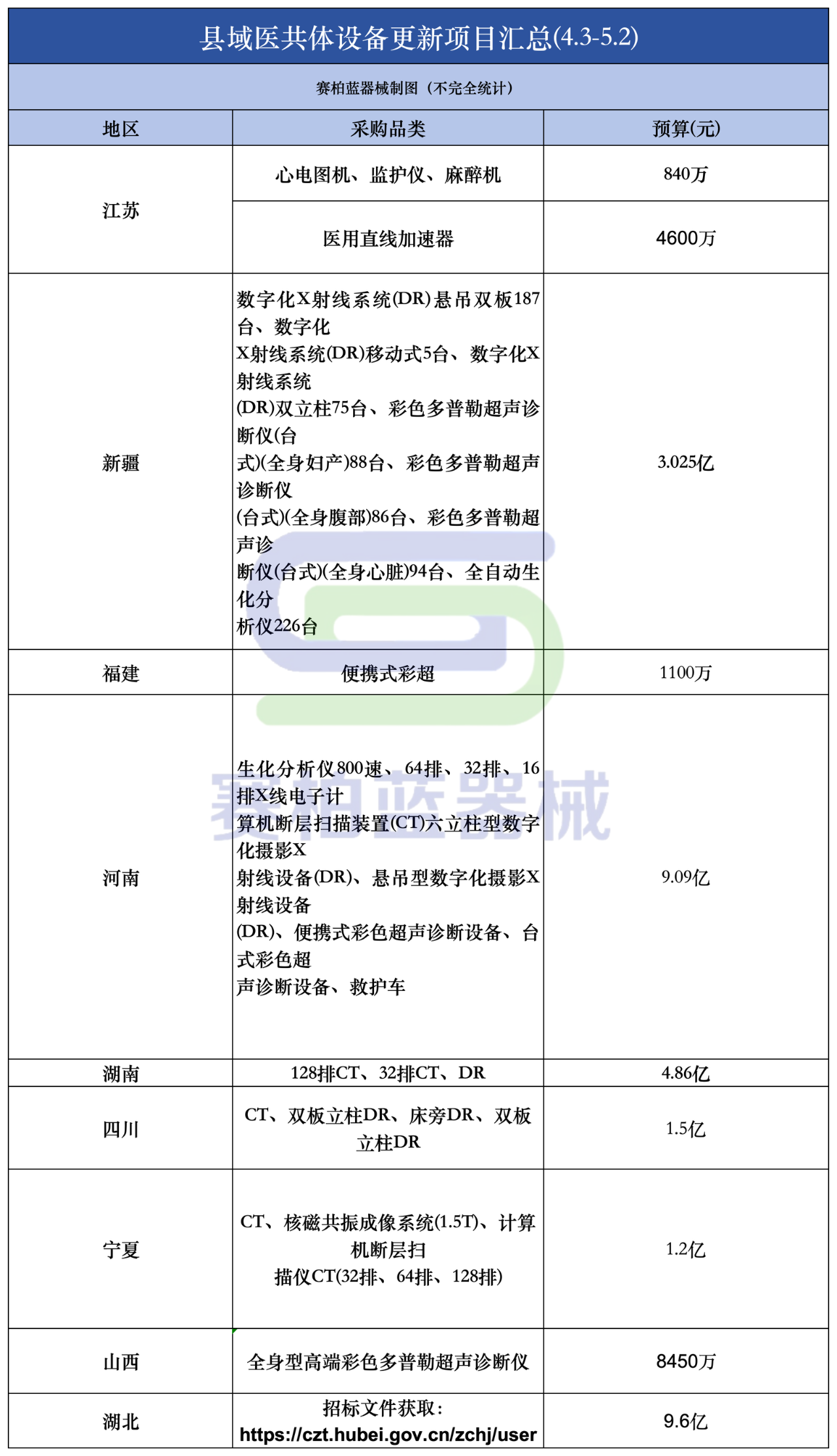 賽柏藍器械查詢發現,僅近一個月內,中國政府采購網關于“縣域醫共體”的醫療設備相關招采就有近50個,包括浙江、黑龍江、山西、四川、江蘇、新疆、河南、福建、寧夏、湖北、山東等地。