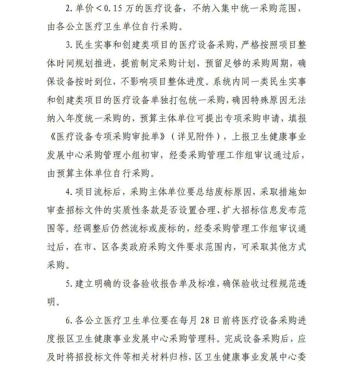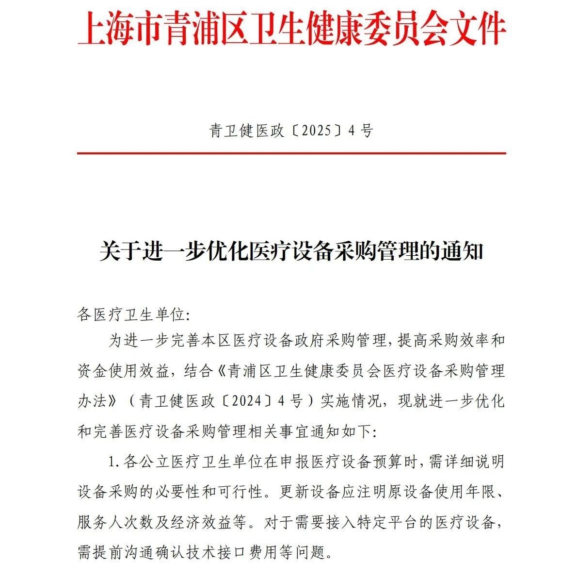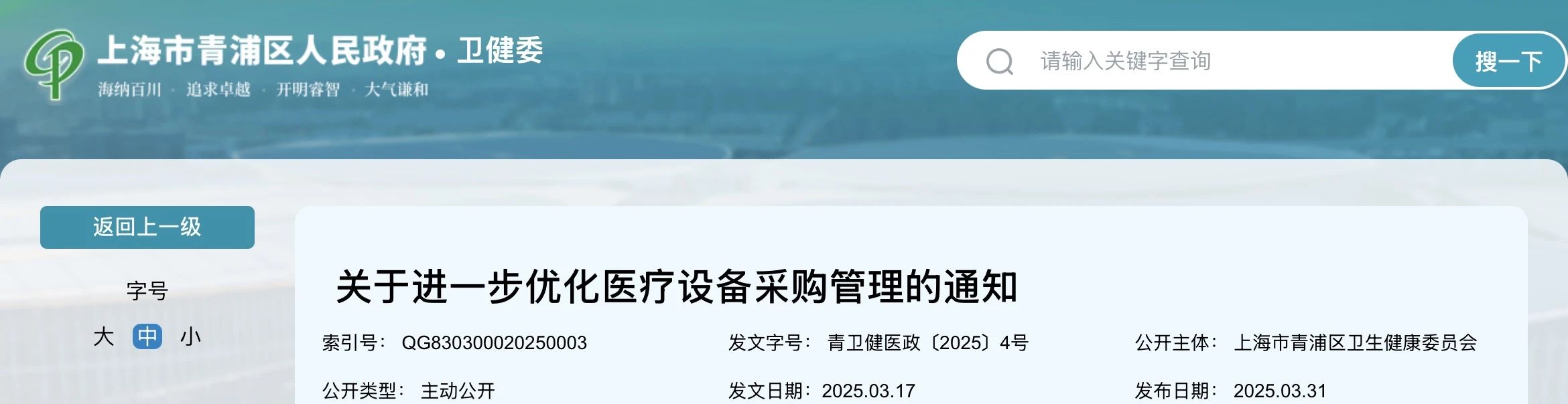 此外,在設(shè)備采購(gòu)管理的政策上也有細(xì)化和調(diào)整,對(duì)相關(guān)采購(gòu)管理提出更高要求。日前,上海市青浦區(qū)衛(wèi)健委發(fā)布《關(guān)于進(jìn)一步優(yōu)化醫(yī)療設(shè)備采購(gòu)管理的通知》(簡(jiǎn)稱《通知》),覆蓋申報(bào)要求、時(shí)間規(guī)劃、采購(gòu)形式、質(zhì)控督查等諸多細(xì)則(完整見(jiàn)文末)。