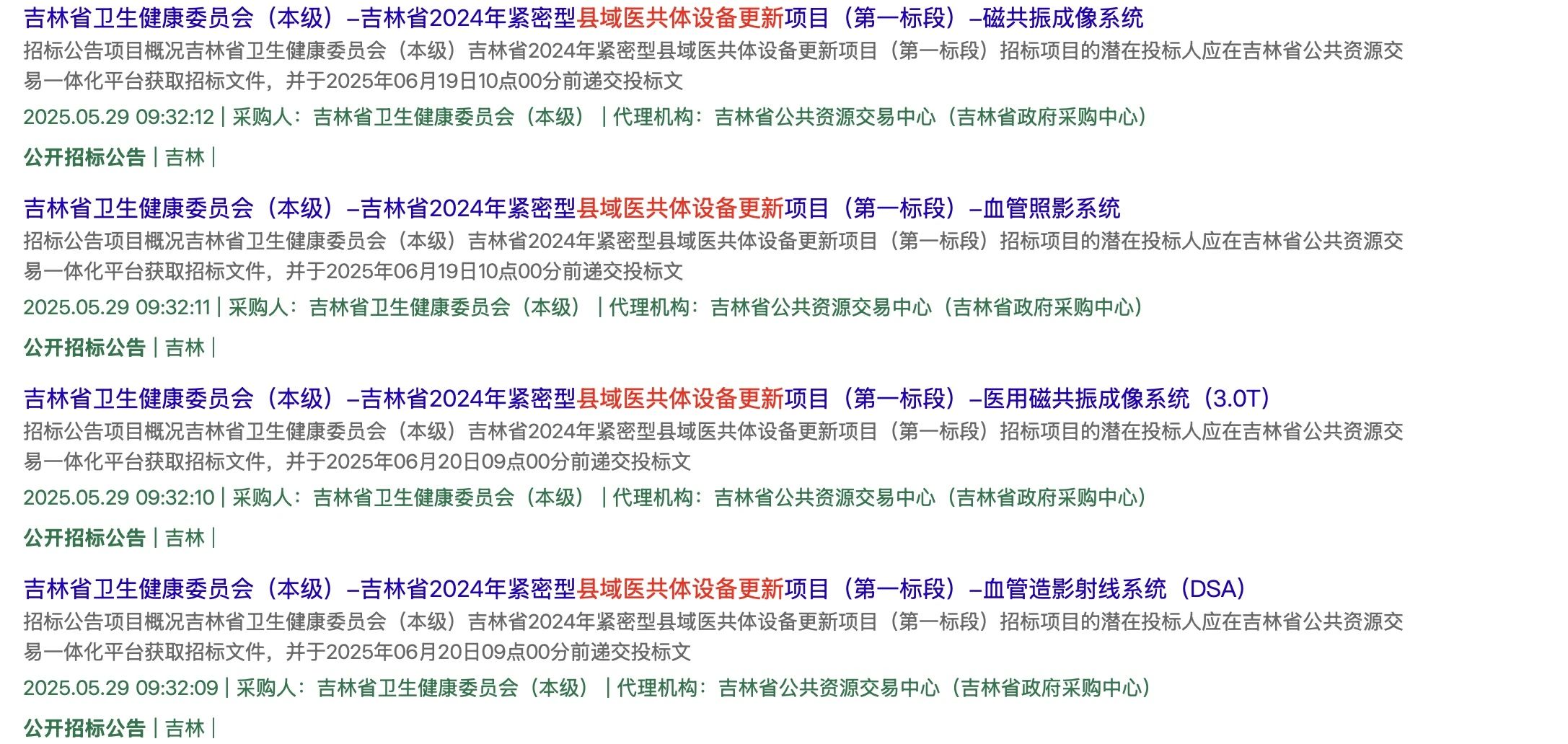 醫(yī)療設(shè)備采購(gòu)在5月迎來(lái)爆發(fā),其中縣域醫(yī)共體采購(gòu)項(xiàng)目較為密集,安徽、黑龍江、遼寧、福建、新疆、山西等多地以發(fā)布招標(biāo)公告,項(xiàng)目總預(yù)算已達(dá)十幾億元規(guī)模。今日(5月29日),吉林省2024年緊密型縣域醫(yī)共體設(shè)備更新項(xiàng)目正式啟動(dòng),覆蓋磁共振成像系統(tǒng)、血管照影系統(tǒng)、血管造影射線系統(tǒng)、醫(yī)用磁共振成像系統(tǒng)四大類別。