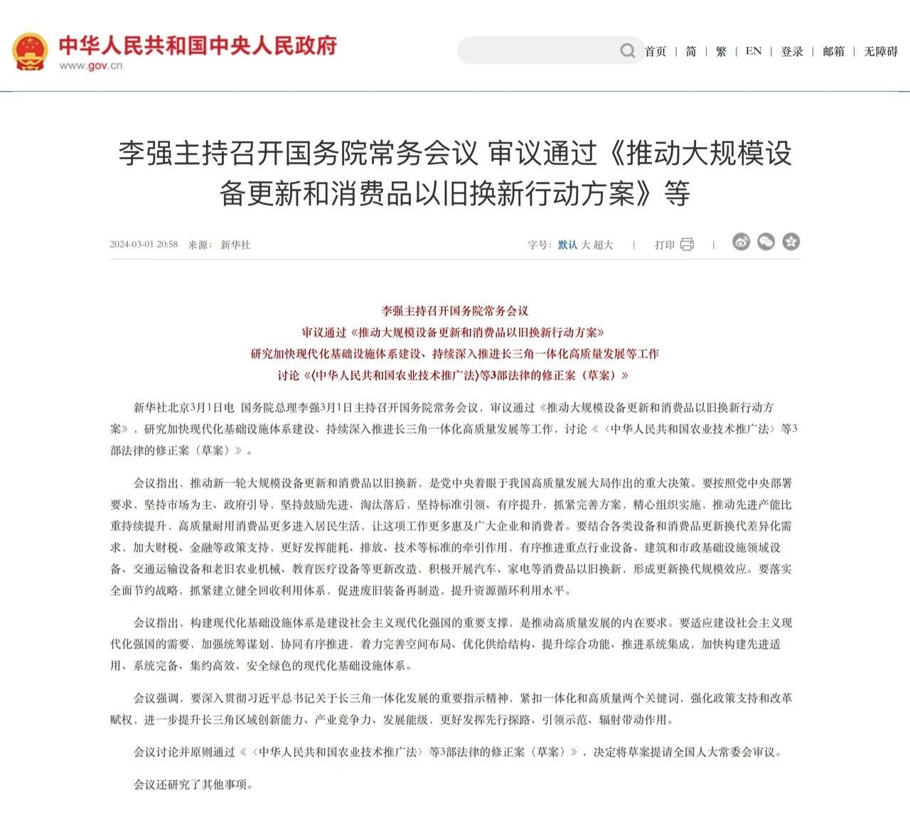 新華社報道,國務院總理李強3月1日主持召開國務院常務會議,審議通過《推動大規模設備更新和消費品以舊換新行動方案》,研究加快現代化基礎設施體系建設、持續深入推進長三角一體化高質量發展等工作,討論《〈中華人民共和國農業技術推廣法〉等3部法律的修正案(草案)》。