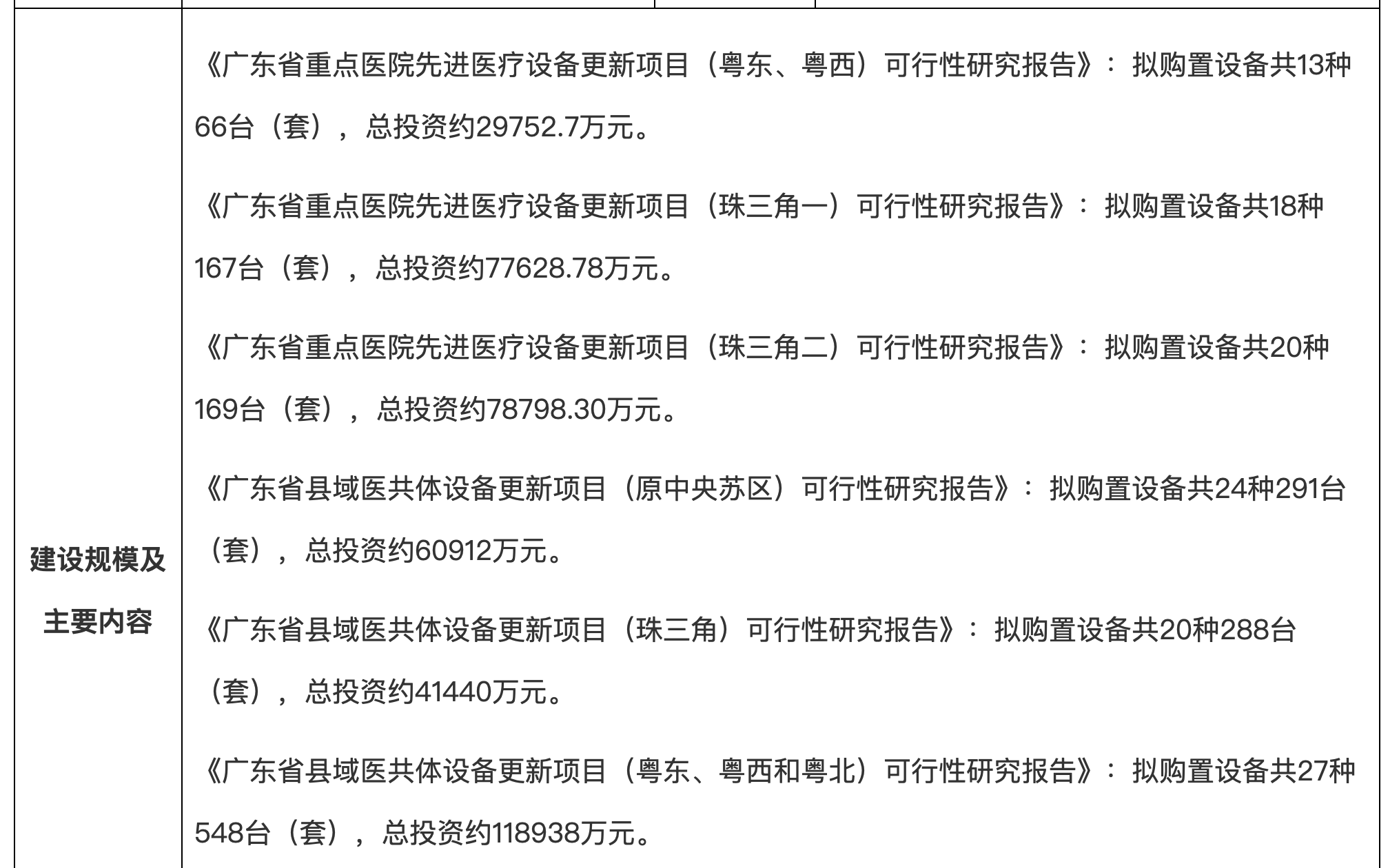 《廣東省重點醫院先進醫療設備更新項目(珠三角一)可行性研究報告》:擬購置設備共18種167臺(套),總投資約77628.78萬元。